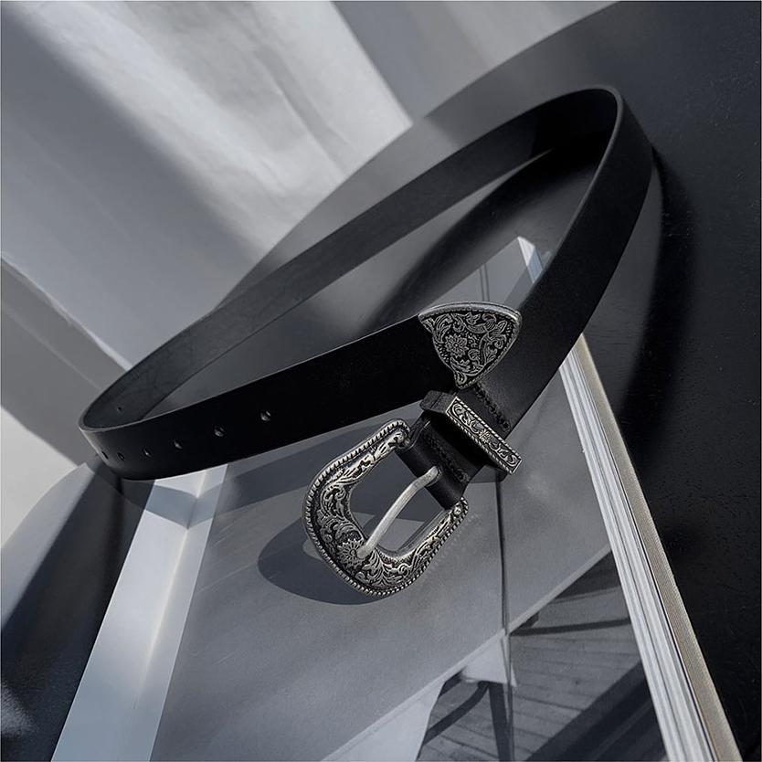黑色皮革搭配仿舊銀色雕花扣環,展現西部風格與細膩質感。