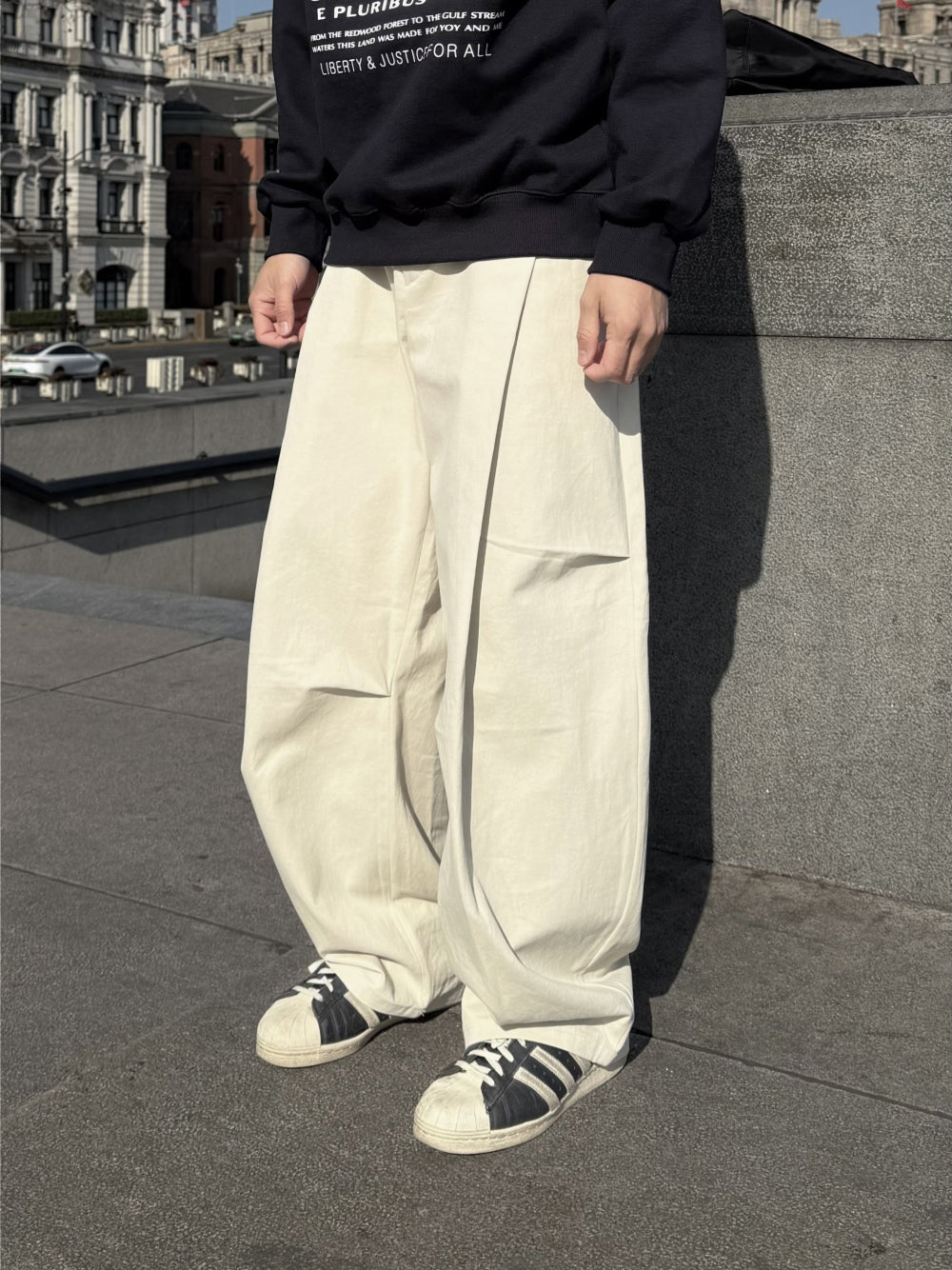 - 正面的單摺與降落傘褲設計,打造特別的造型