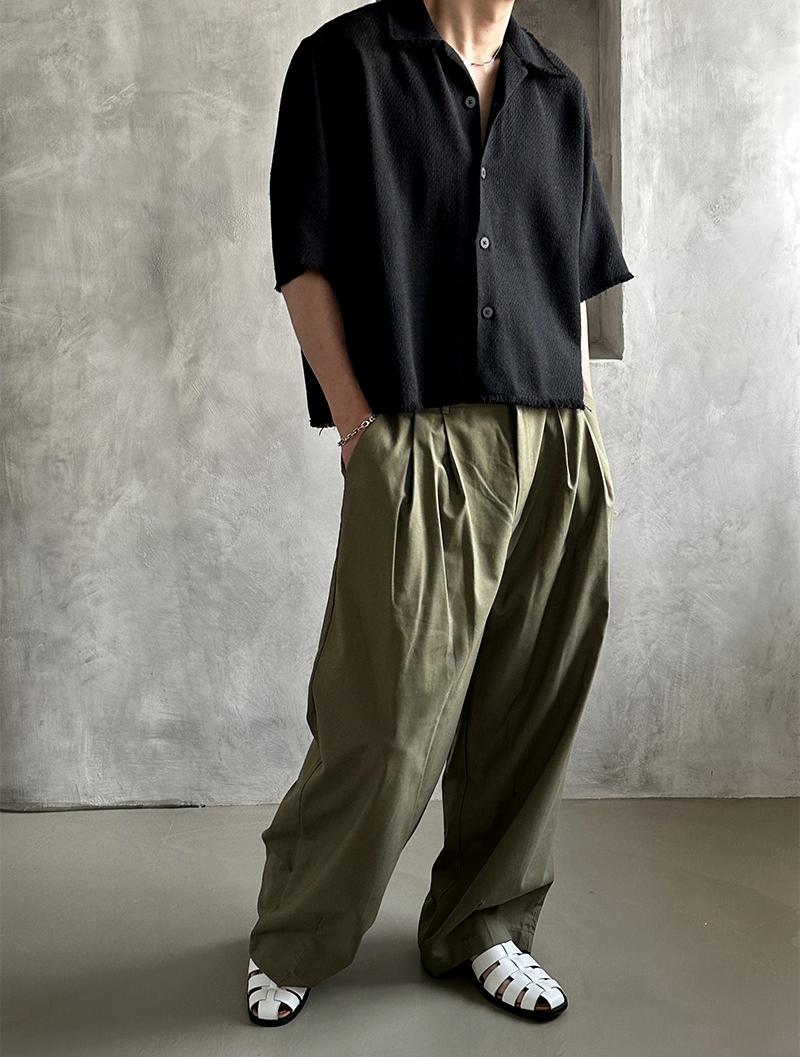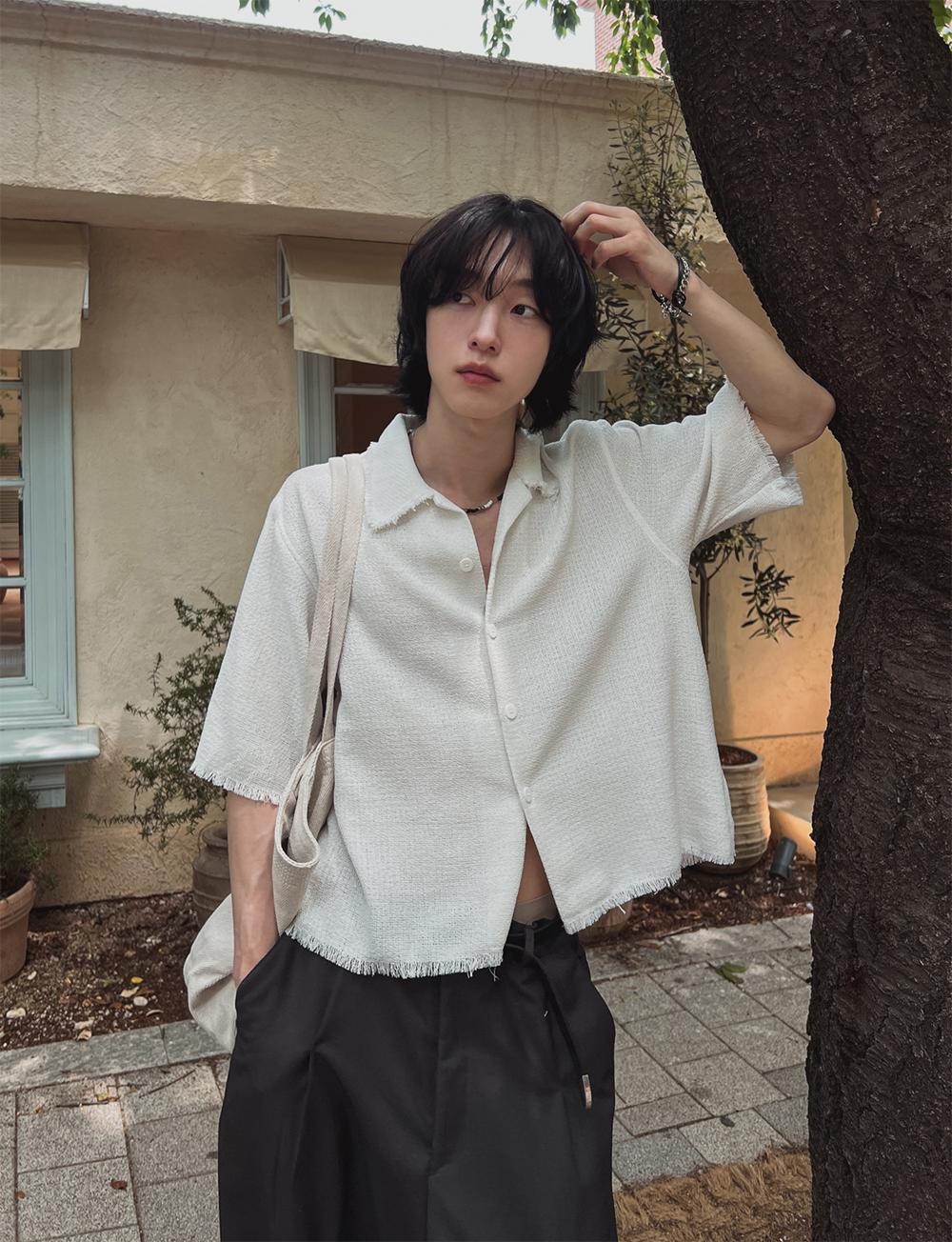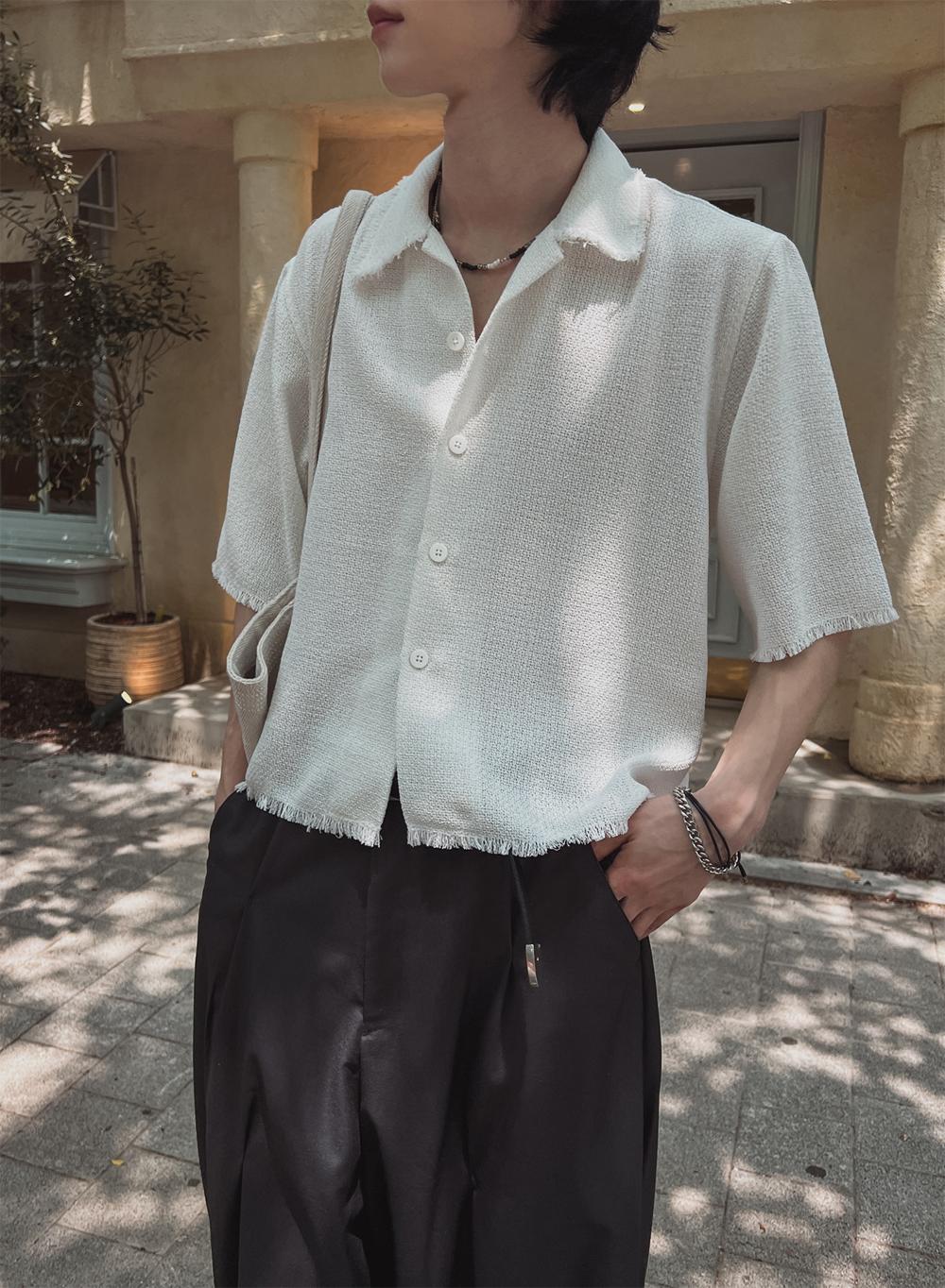 粗花呢 抽鬚 五分袖 短版 襯衫 / 2色