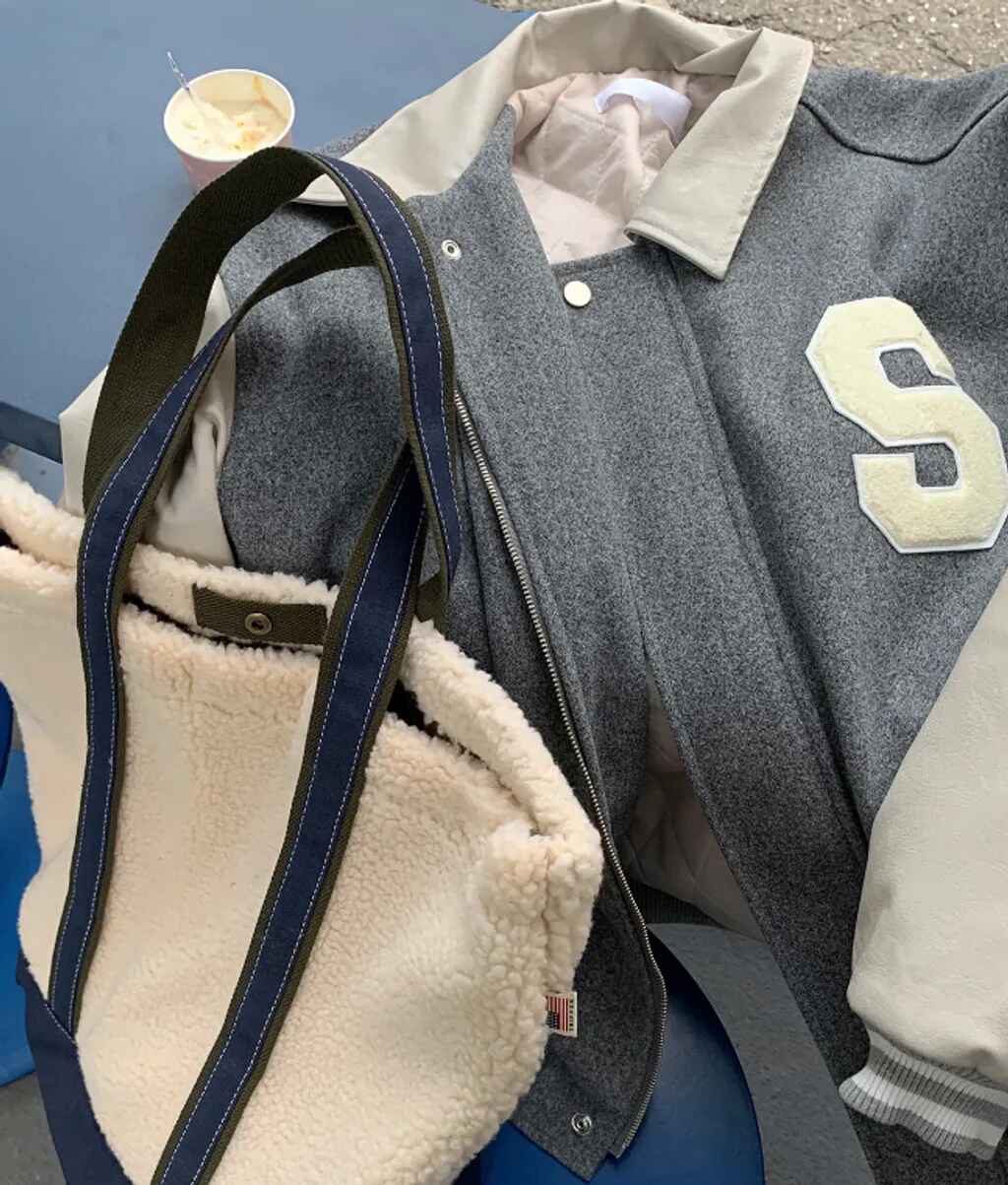 羊羔絨 拼接 帆布 寬底 肩背 托特包