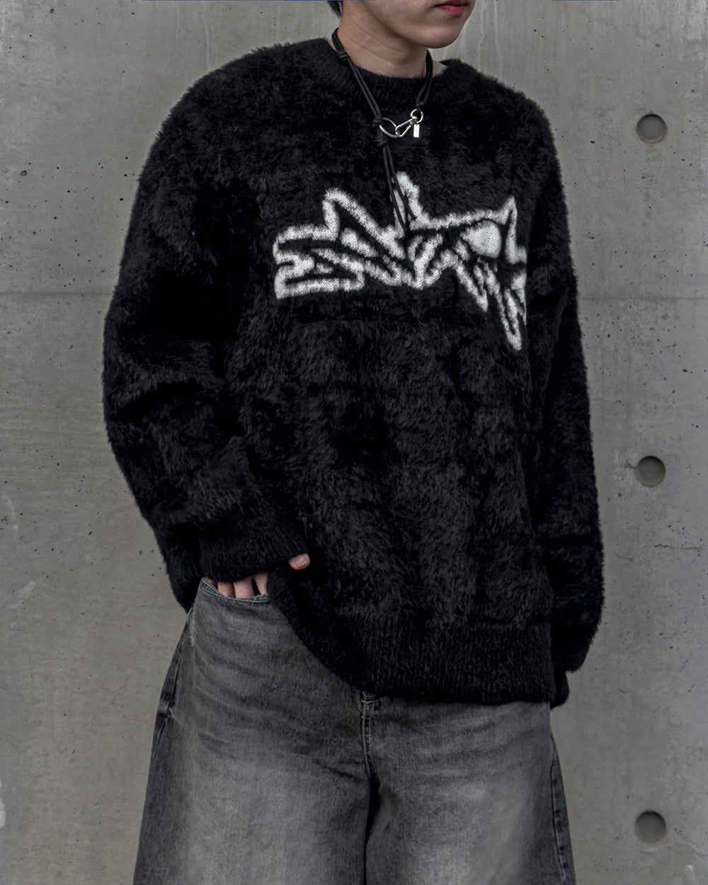 街頭 馬海毛 塗鴉 落肩 毛衣 / 3色