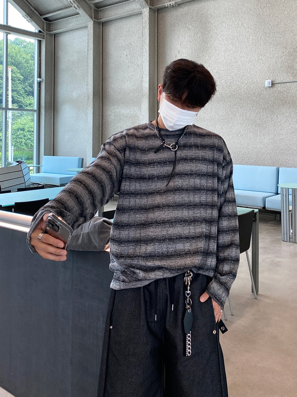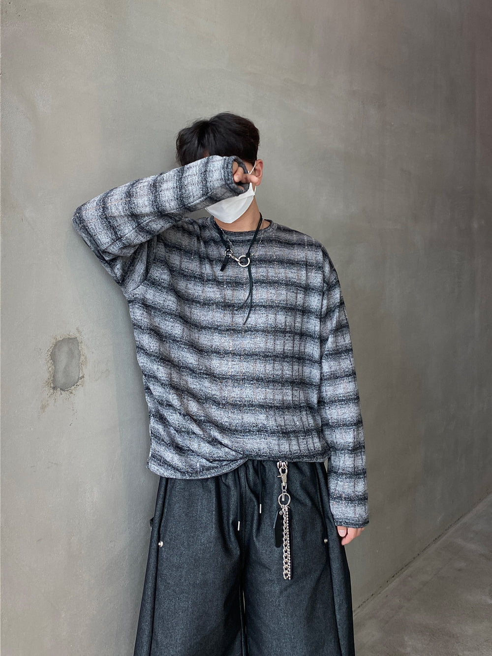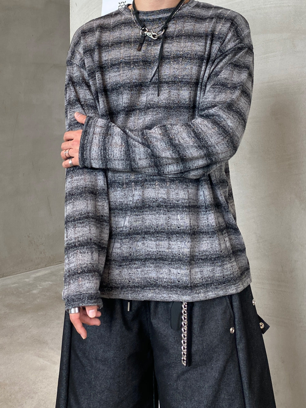條紋 寬鬆 針織 薄長袖 上衣 / 3色