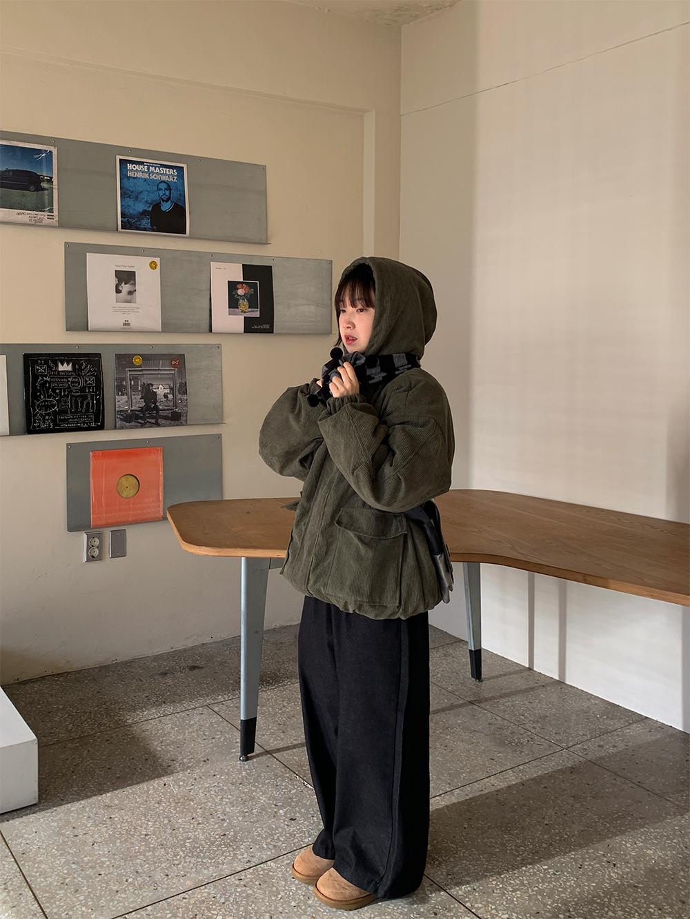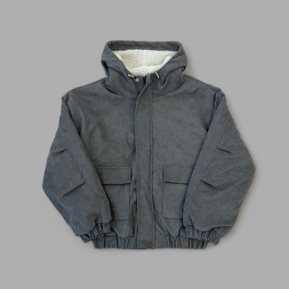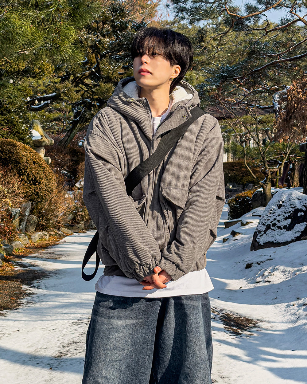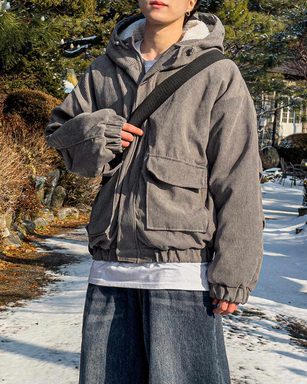 。這款燈芯絨材質的的刷毛連帽外套,擁有休閒感十足的剪裁!
