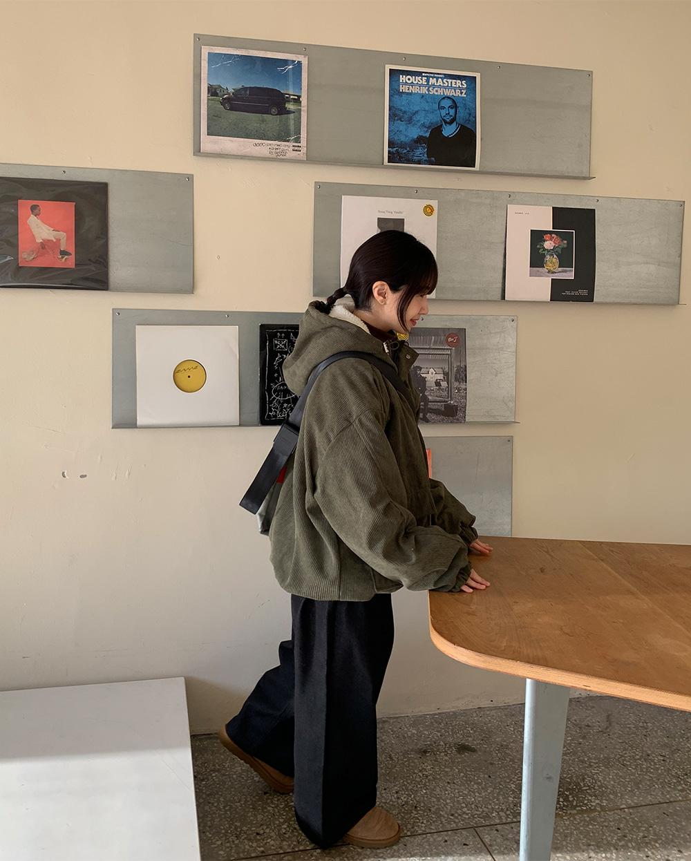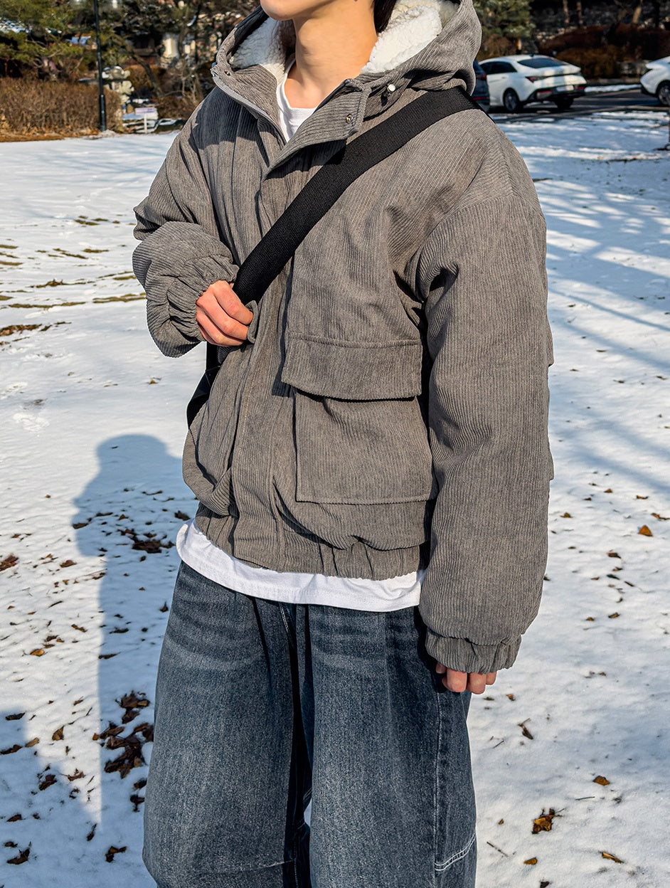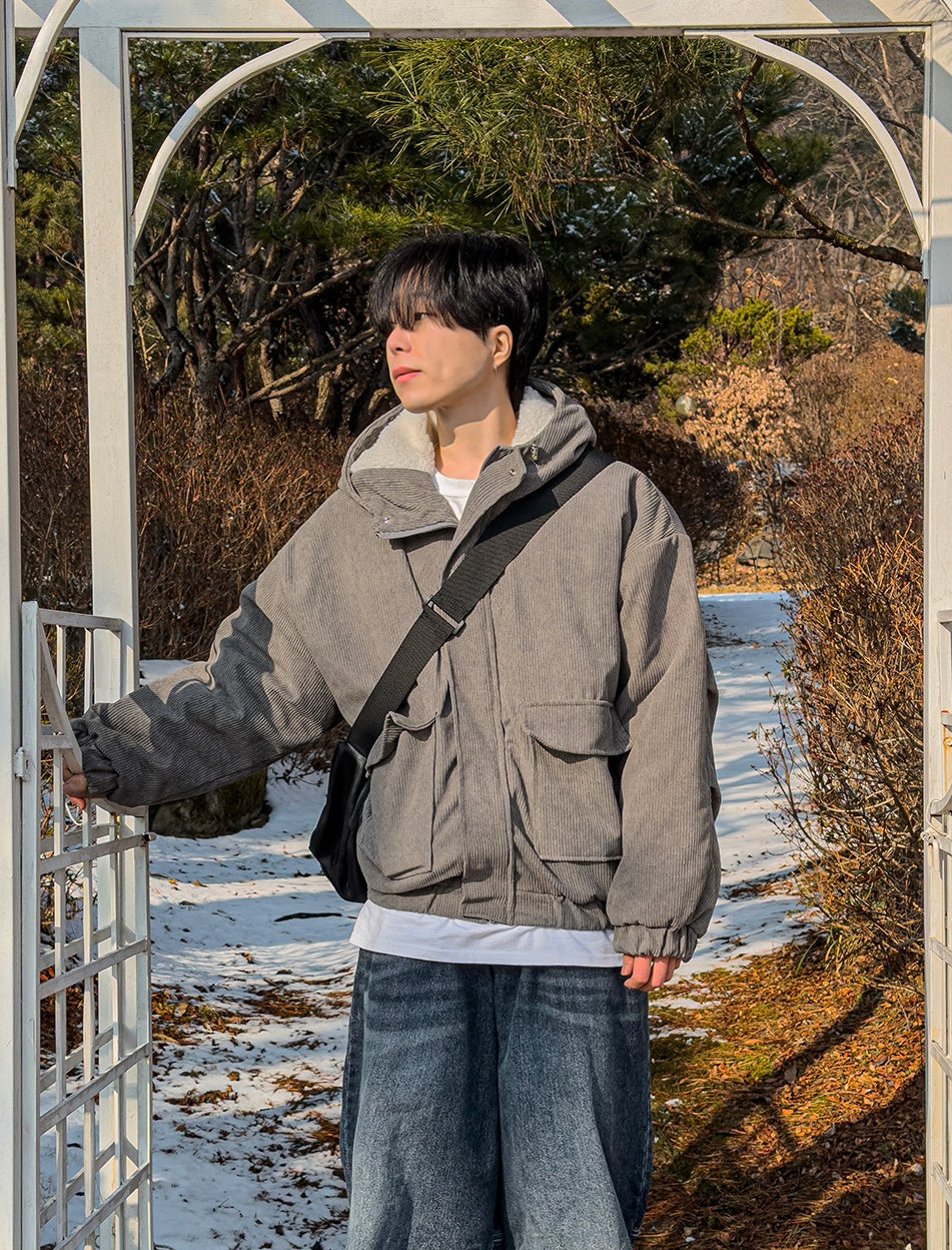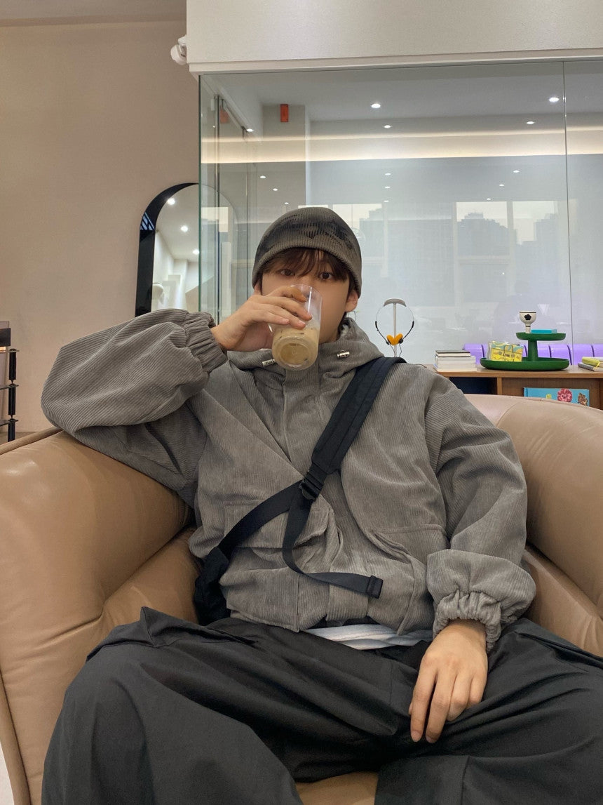 。這款燈芯絨材質的的刷毛連帽外套,擁有休閒感十足的剪裁!