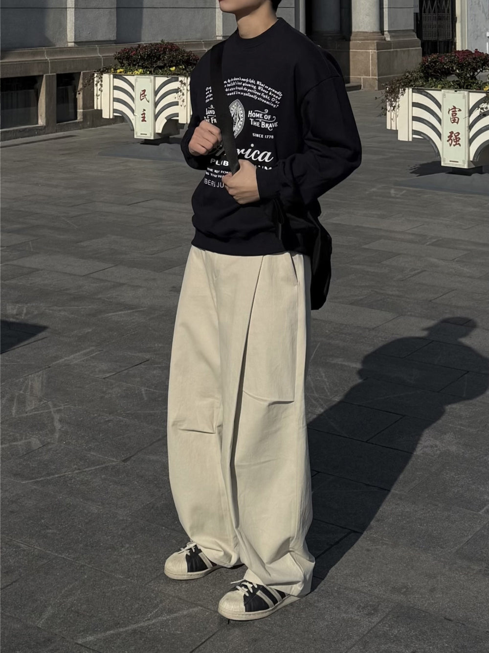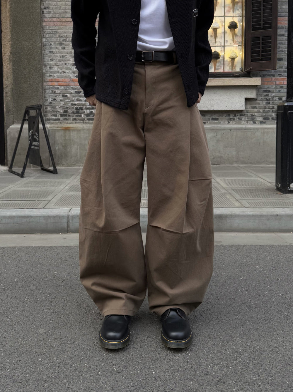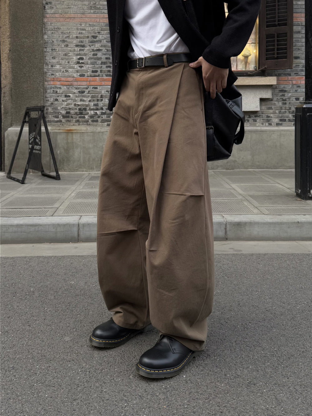- 正面的單摺與降落傘褲設計,打造特別的造型
