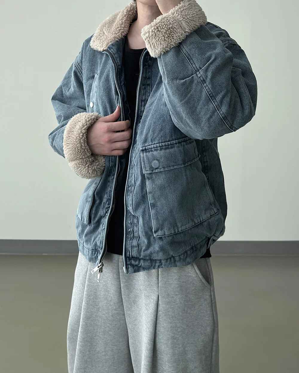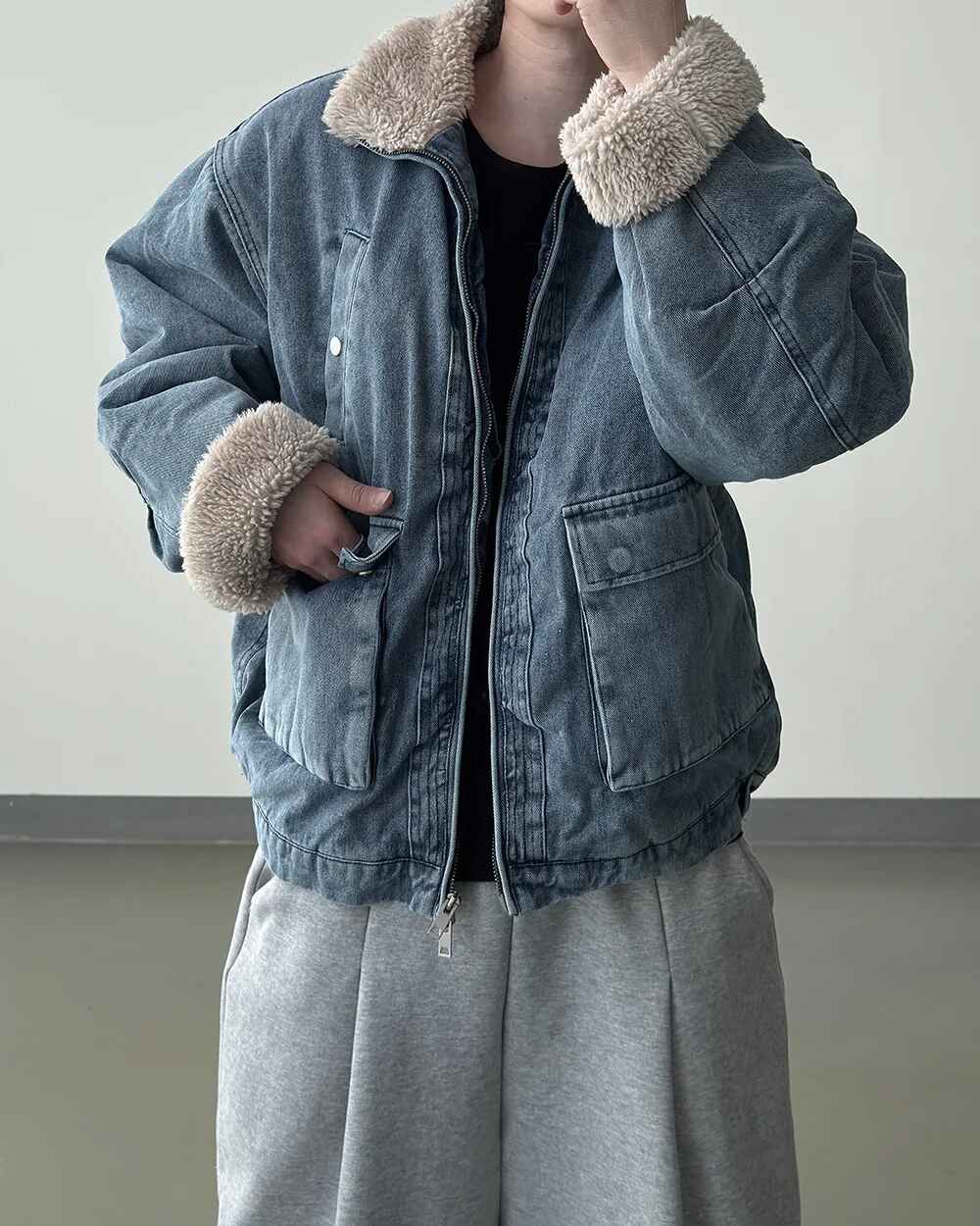 羊羔毛 水洗 做舊 工裝 牛仔外套 / 2色