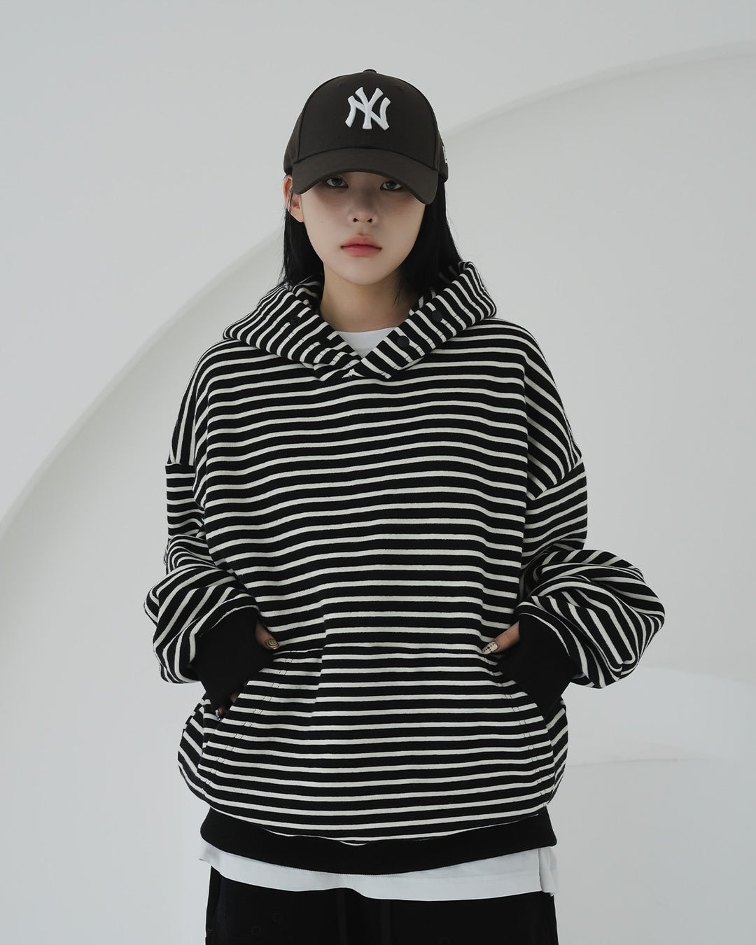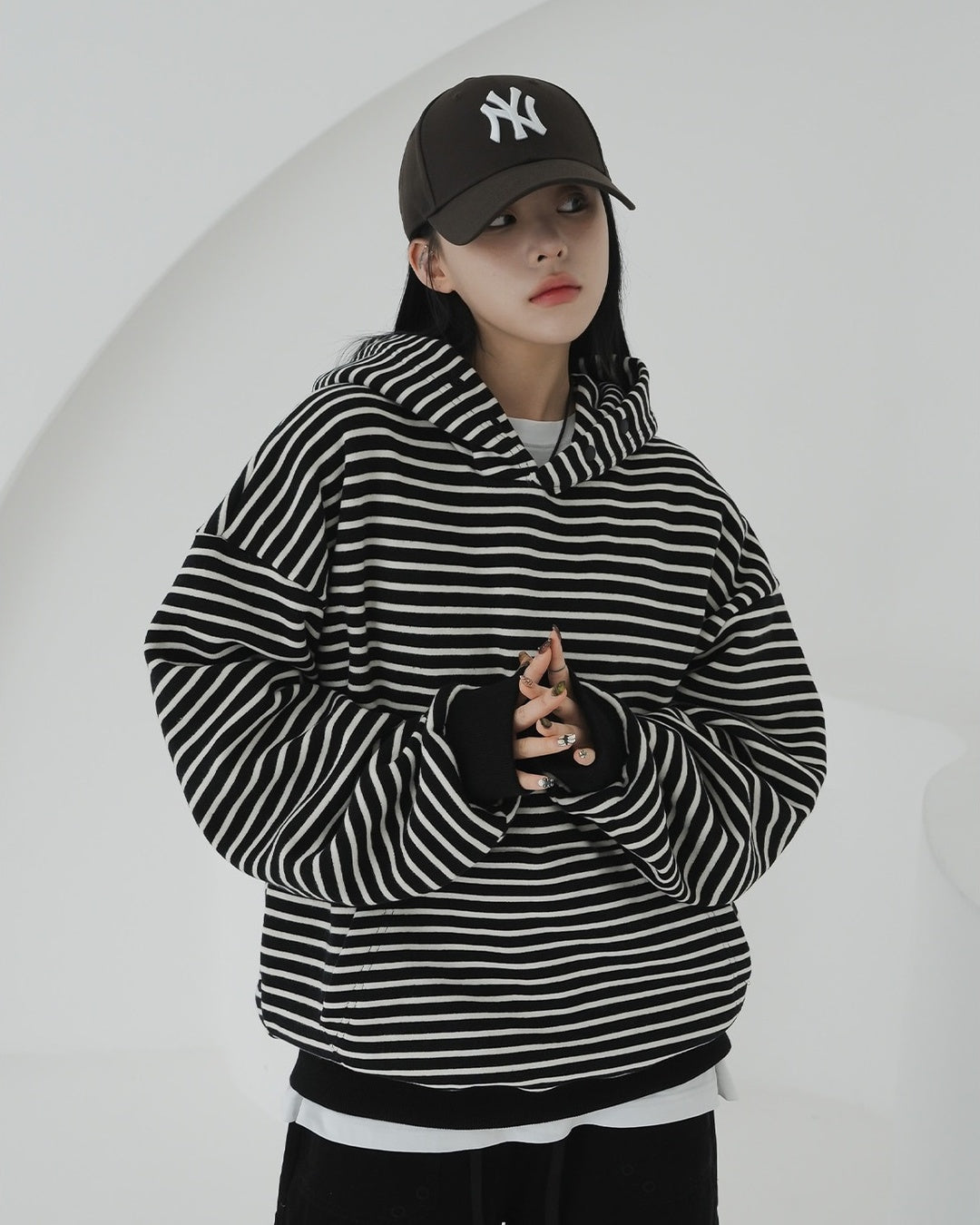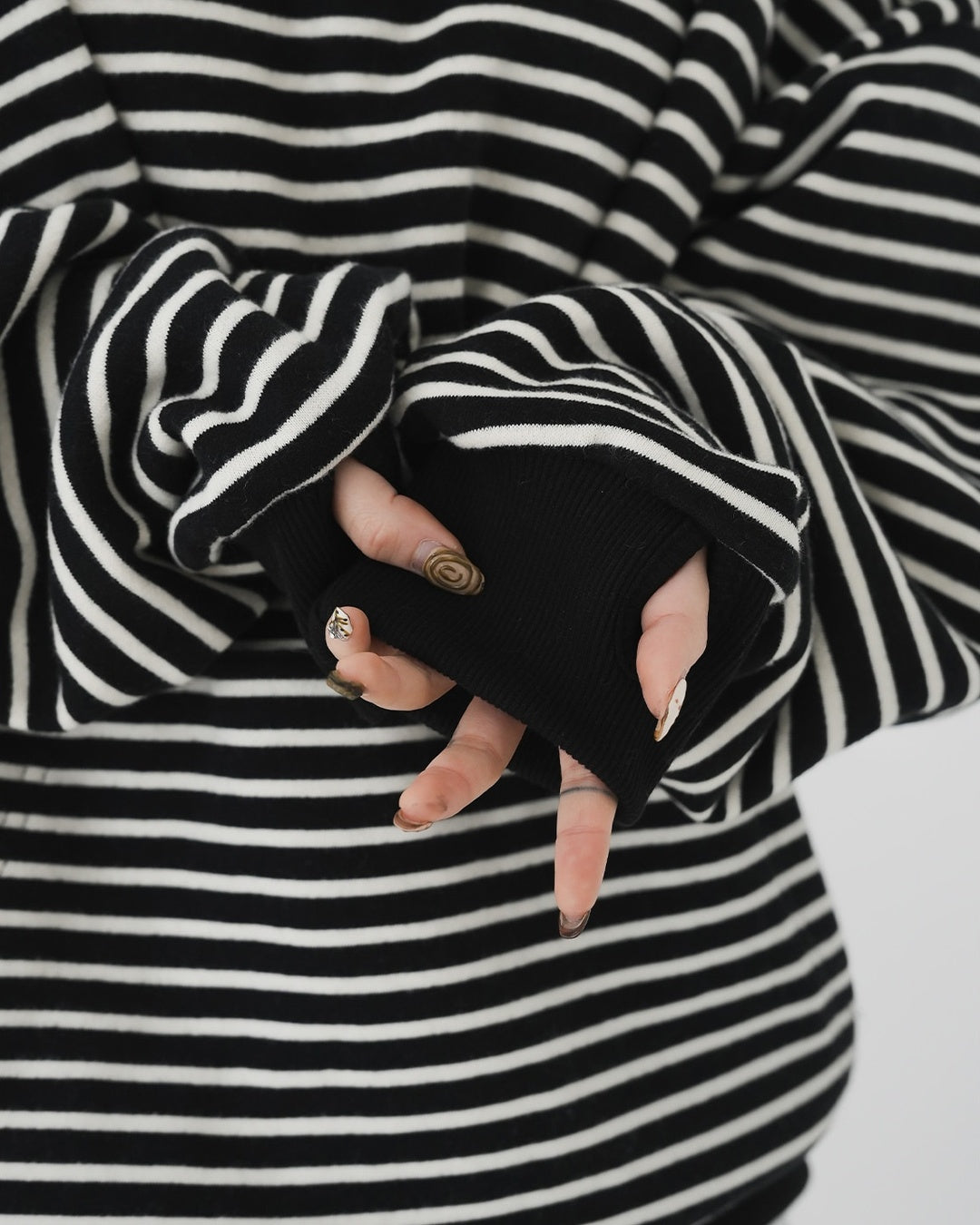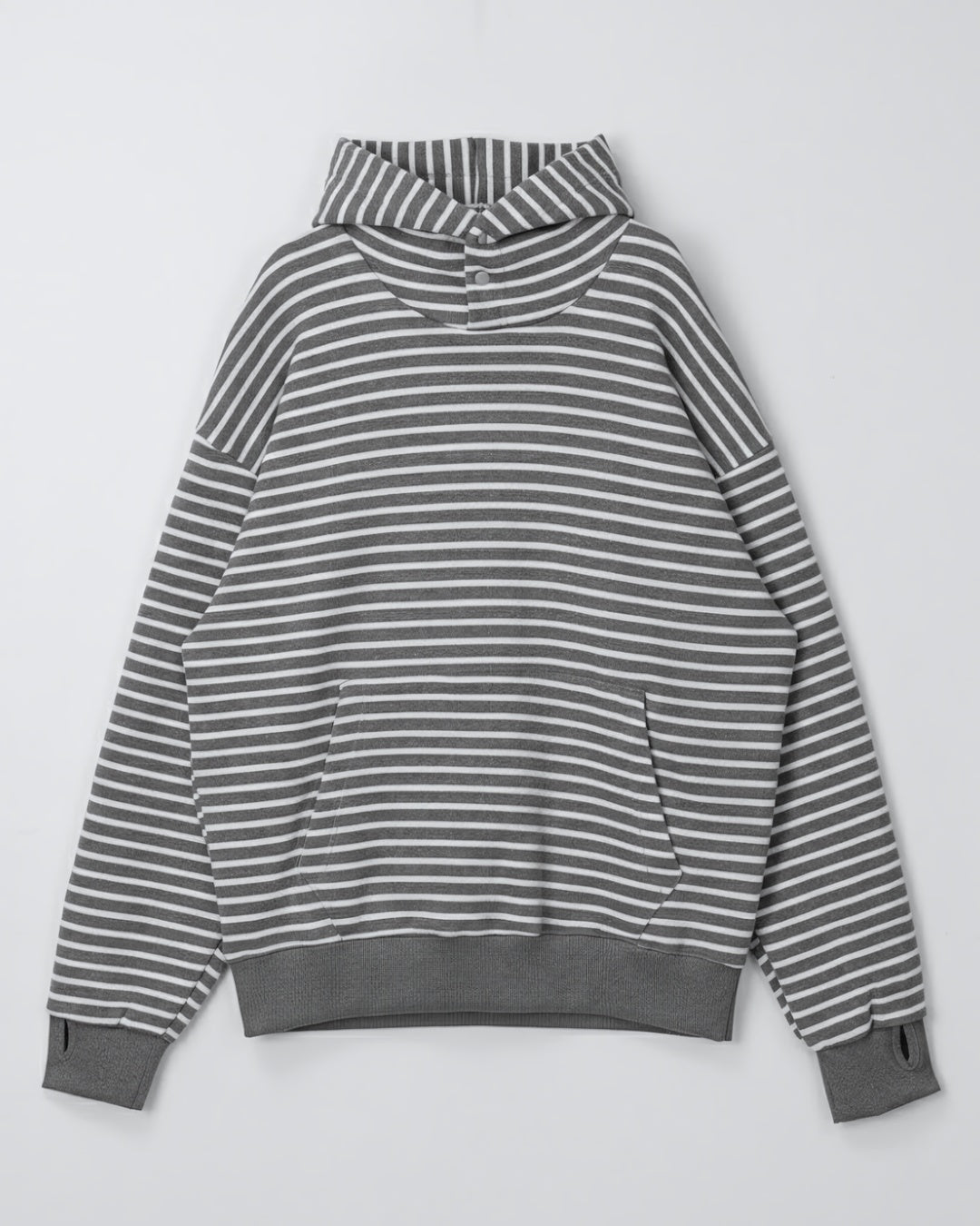 寬鬆 條紋 半開襟 手袖 刷毛 帽T / 3色