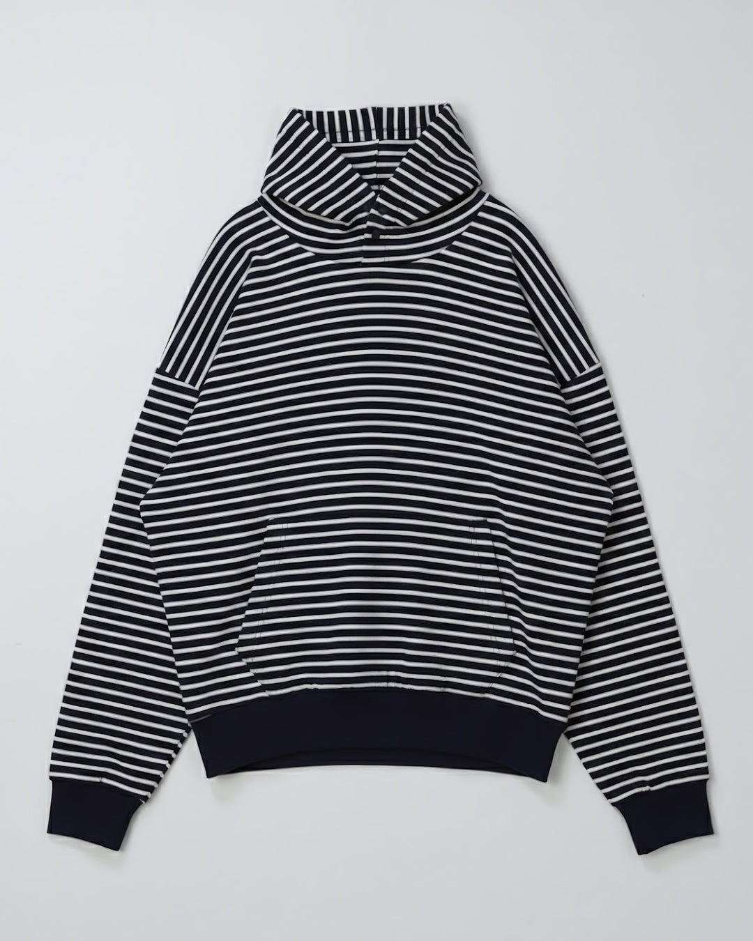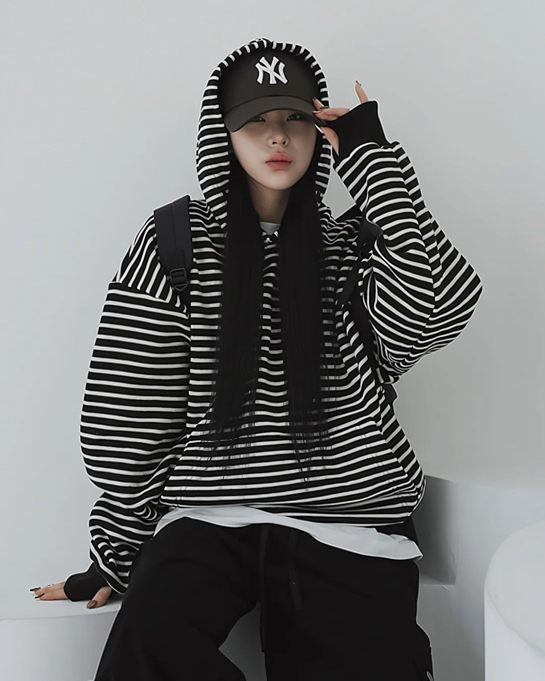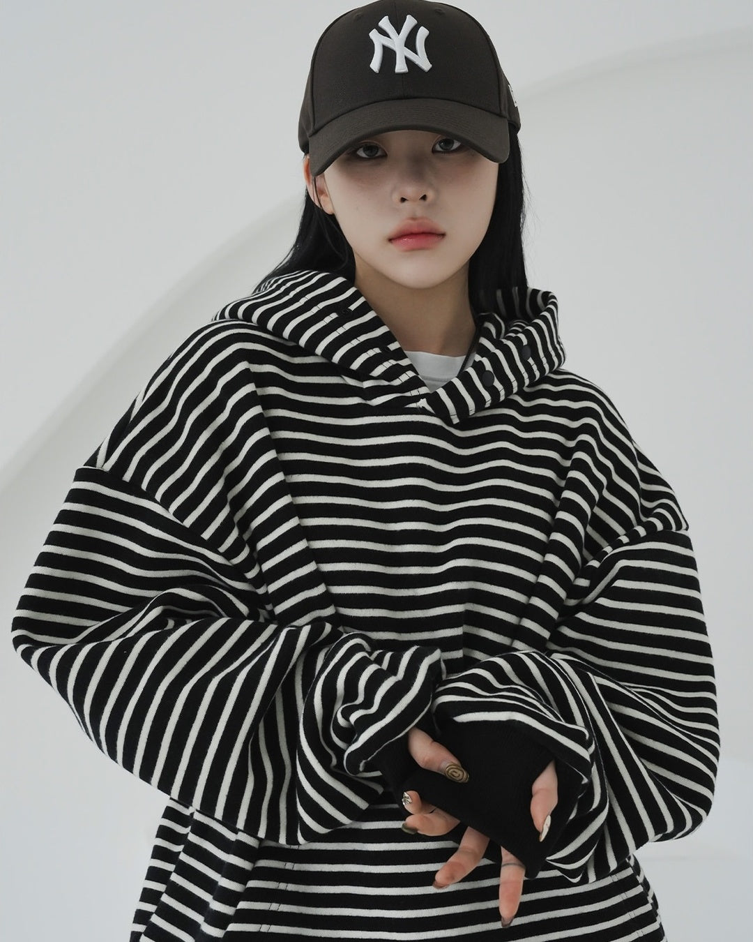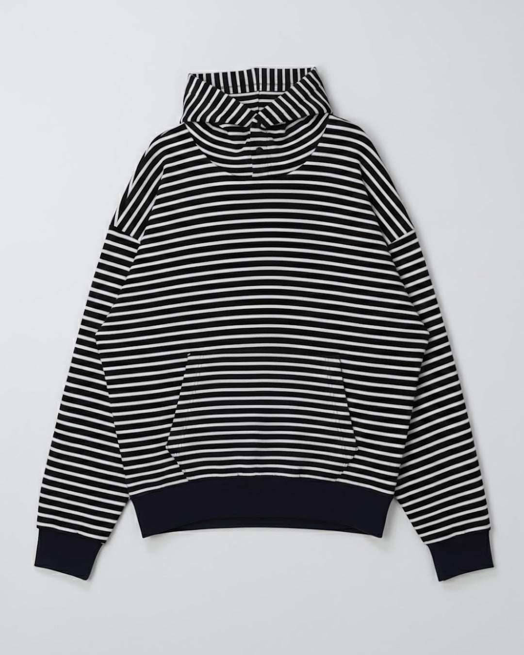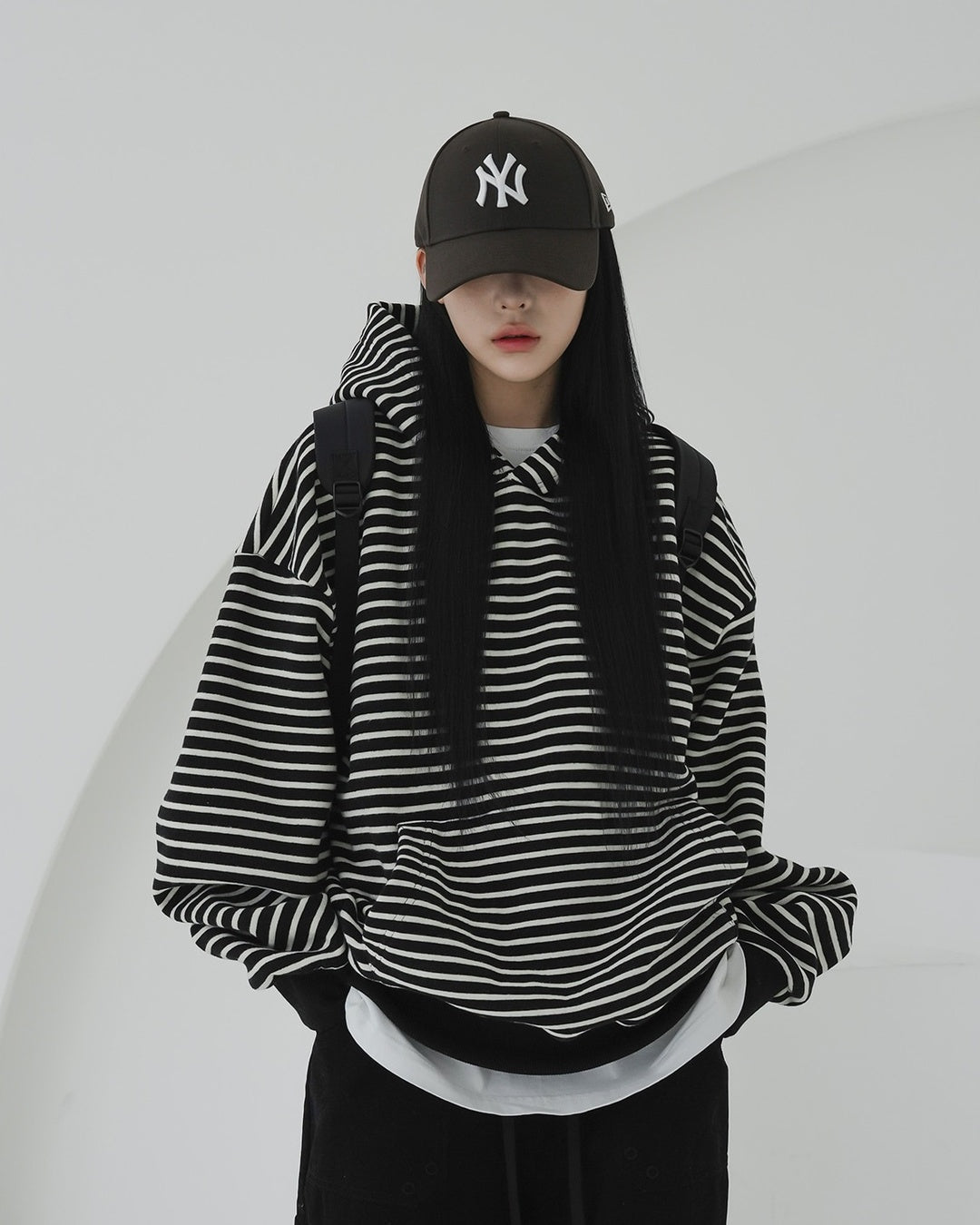 寬鬆 條紋 半開襟 手袖 刷毛 帽T / 3色